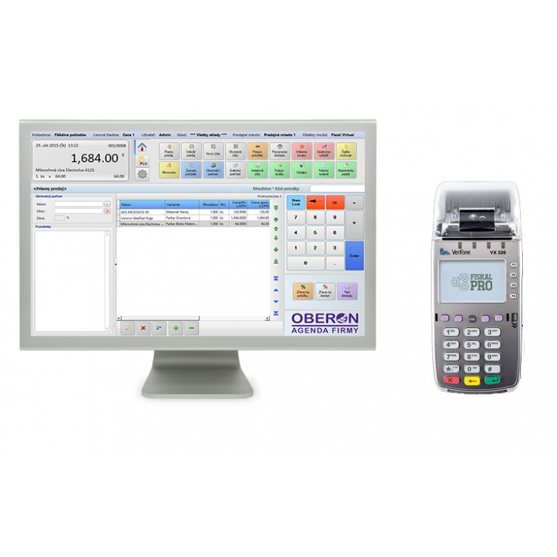 Zostava obsahuje ročnú licenciu programu OBERON, PC zostavu s monitorom a FiskalPRO T6 s platobnými funkciami.