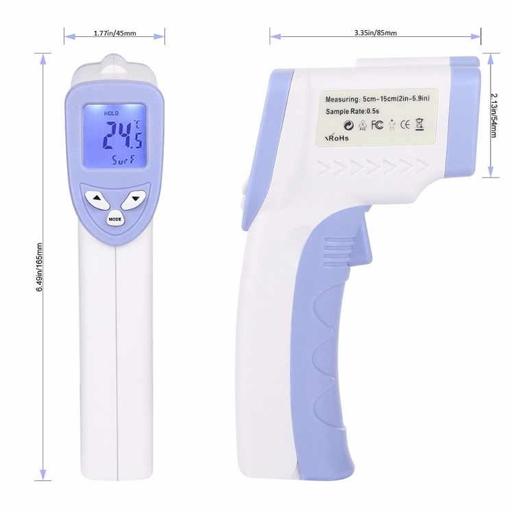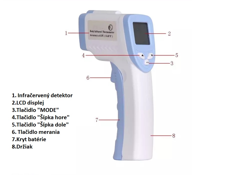 Bezkontaktný digitálny teplomer – na meranie teploty ľudského tela aj povrchovej teploty prostredia, povrchov alebo kvapalín.